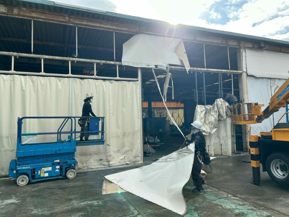 屋外のジャバラカーテン経年劣化による外観損傷のため 交換してほしいという要望を受けて対応しました。